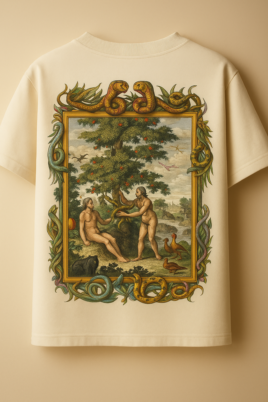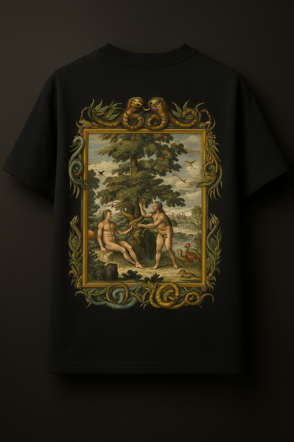 Step into timeless artistry with the ”Forbidden Masterpiece Tee”, inspired by the Garden of Eden. Crafted from a premium blend of 90% French terry and 10% cotton, this tee is breathable, lightweight, and comfortable for all-day wear. Designed with collar ribs for durability and a refined finish, it balances style and comfort effortlessly.